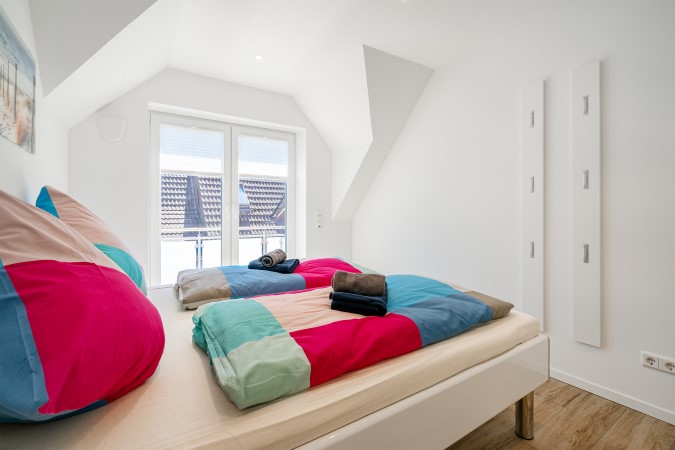 Ein Schlafzimmer mit Doppelbett (180x200) und Kleiderschrank befindet sich auf derselben Etage. Das zweite und dritte Schlafzimmer, eines mit zwei Einzelbetten, eines mit Doppelbett (180x200) sind über eine Treppe im Wohnbereich erreichbar. Hier findet sich auch im Doppelbett-Zimmer ein Kleiderschrank sowie ein Komfort-Lesesessel und ein TV für entspannte Stunden. Aus dem Dachfenster ist der Deich zu sehen.